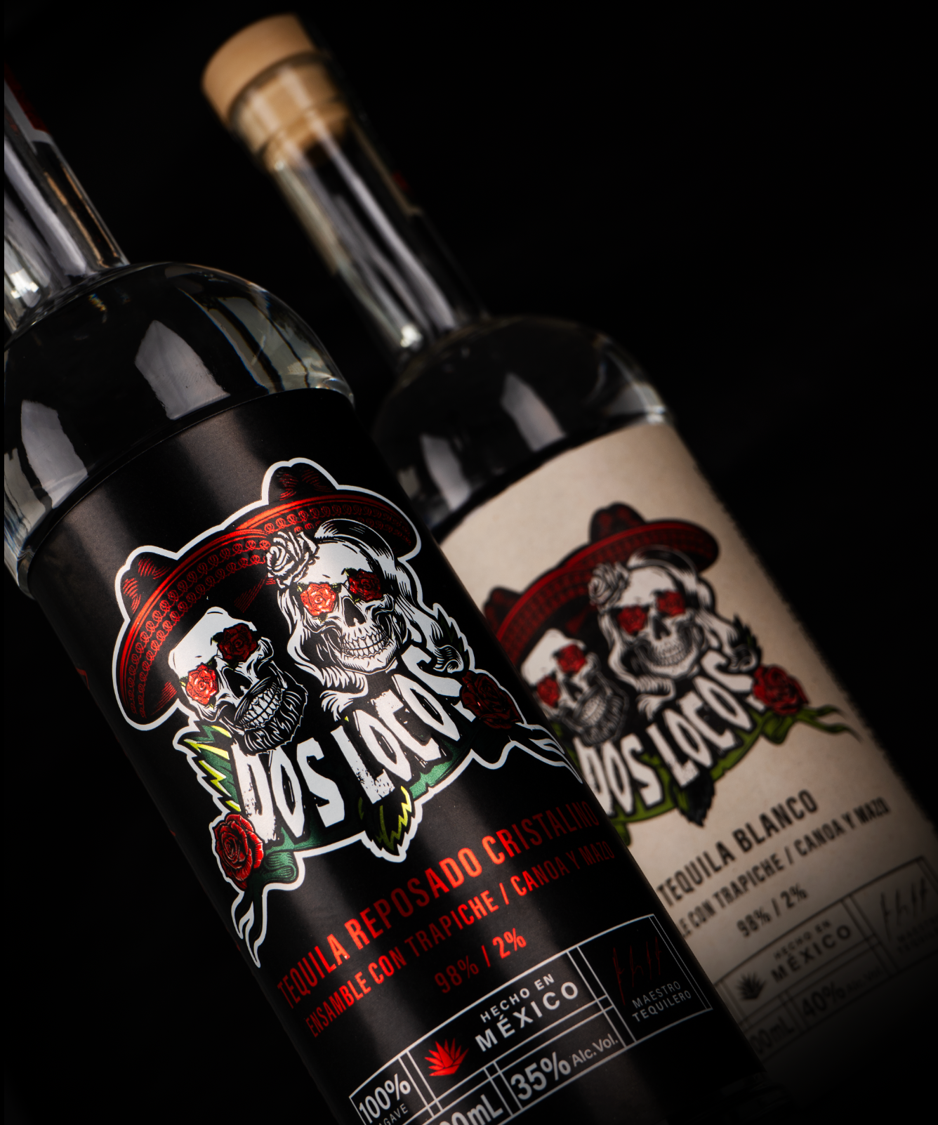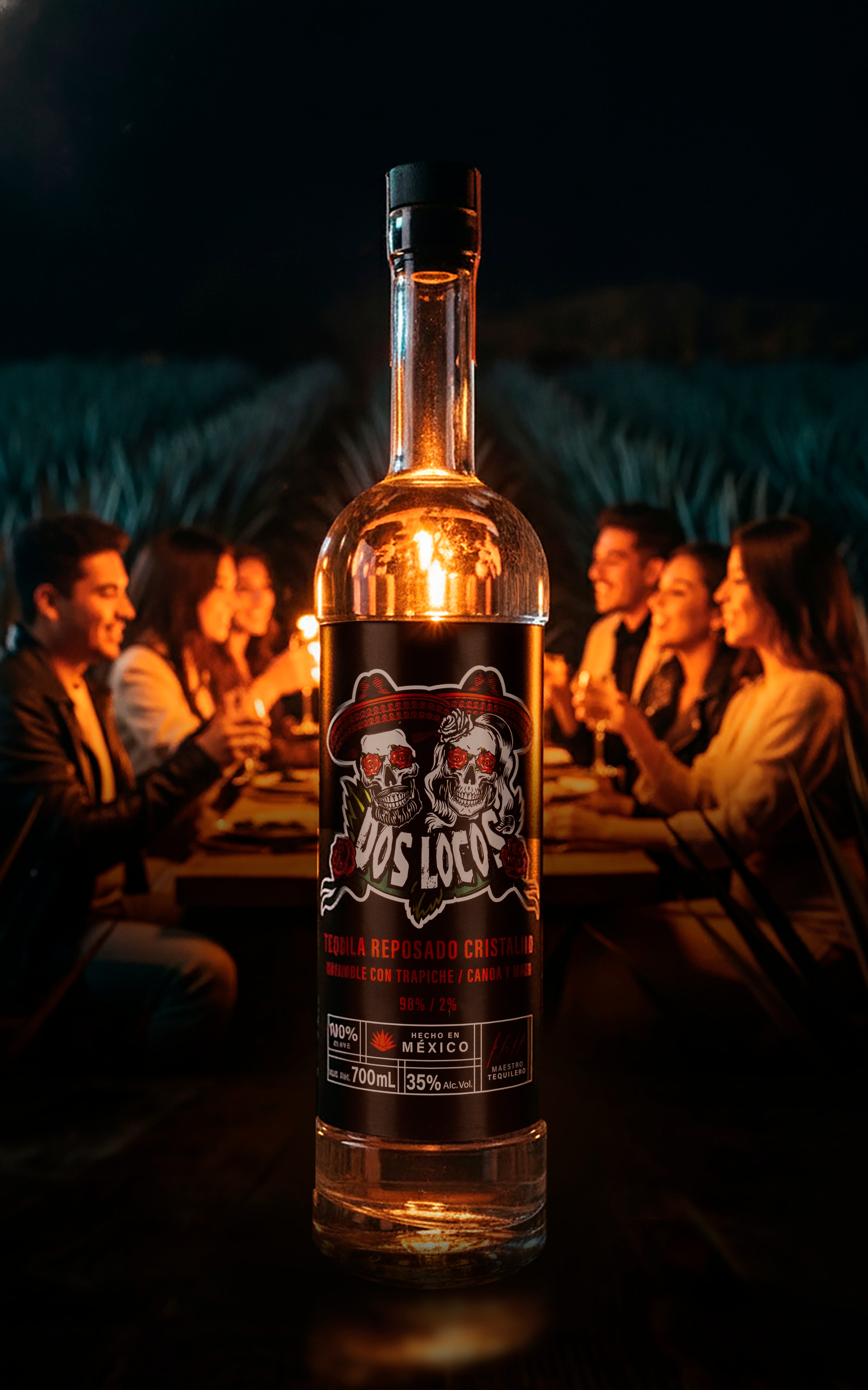 700 ml · 40 % Vol. Alc. · NOM 1459 Dos Locos Reposado Cristalino: la calma después del fuego.